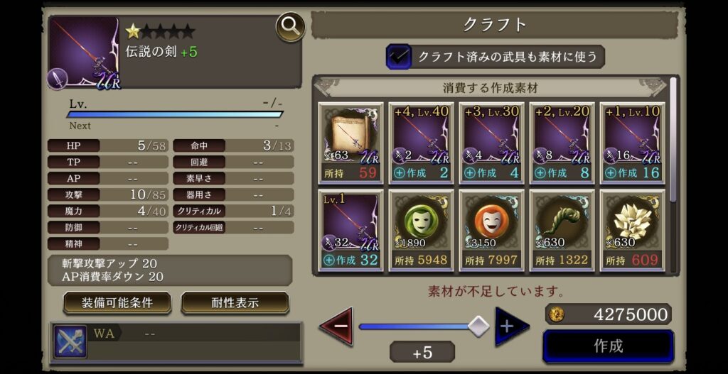 | +5製作までに消費する作成素材 |